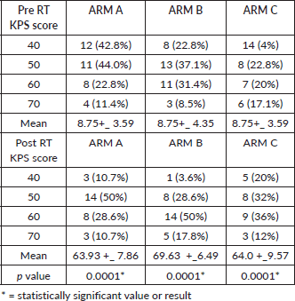 Patients were assessed on the basis of KPS before and after completion of treatment in all the arms. There was statistically significant improvement of KPS Score Post RT in all the arms, p value <0.0001.