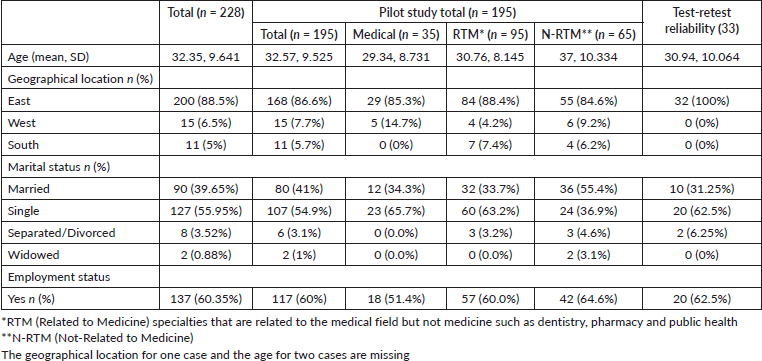 Table 1. Socio-demographic characteristics of the 228 participants recruited for the test-retest reliability [33] and for the pilot study used to test internal consistency and construct validity (195).
