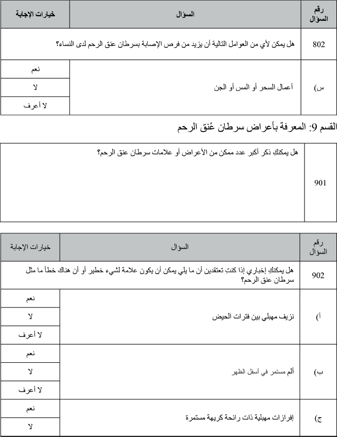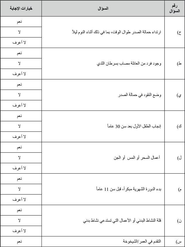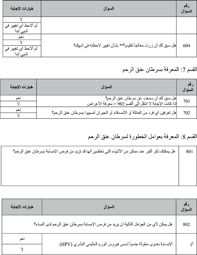 To enhance cultural sensitivity, modifications were made to the BC and CC risk factors. In the CC section, the following changes were implemented: ‘having a sexual partner who is not circumcised’ was rephrased to ‘marriage to a man who has not been circumcised,’ ‘having sex at a young age’ was revised to ‘early marriage (i.e., before the age of 18),’ and ‘having many sexual partners’ was rephrased to ‘marriage twice or more’. Questions about ‘bewitchment/witchcraft/evil spirits’ as a risk factor for both BC and CC were modified to more suitable choices for the Arabic culture.