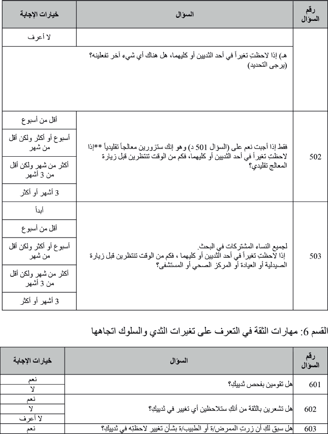 Consequently, the research team decided to remove several socio-demographic questions, modify others to be more culturally appropriate and add a new section to the questionnaire. This new section includes questions designed to assess participants' interest in receiving additional information about BC and CC, identify specific topics they wish to learn more about (e.g., risk factors, symptoms and treatment) and determine their preferred methods for receiving this information (e.g., brochures, workshops and online resources). Supplementary Material 1 provides a detailed list of original questions, modification and reasons for modifications and newly added questions.