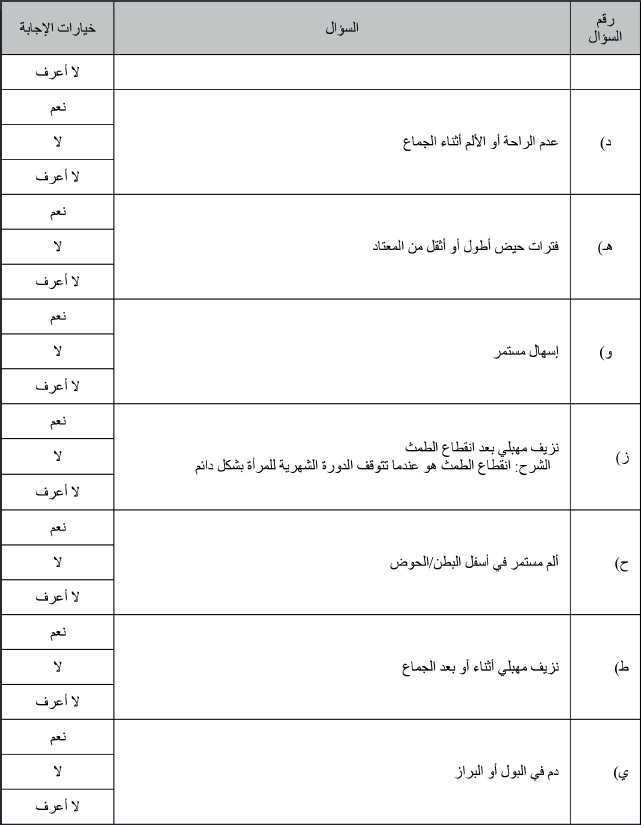 The final questionnaire format incorporates changes based on participant feedback from face validity testing. In the socio-demographic section, several questions were removed due to being deemed unsuitable. Including the question about the primary language used in the participant's home and whether there is tap water in her house, complex or property. Additionally, the question about relationship status was revised by removing the option (‘Living together with a partner’). The options for the highest level of education were also reduced and modified to better align with the Arab community's educational system. The question about internet access was changed to ‘Do you have a continuous internet service?’ Four new questions were added to this section, including questions about nationality, residency, employment status and the relation of their field of study or work to the medical field.