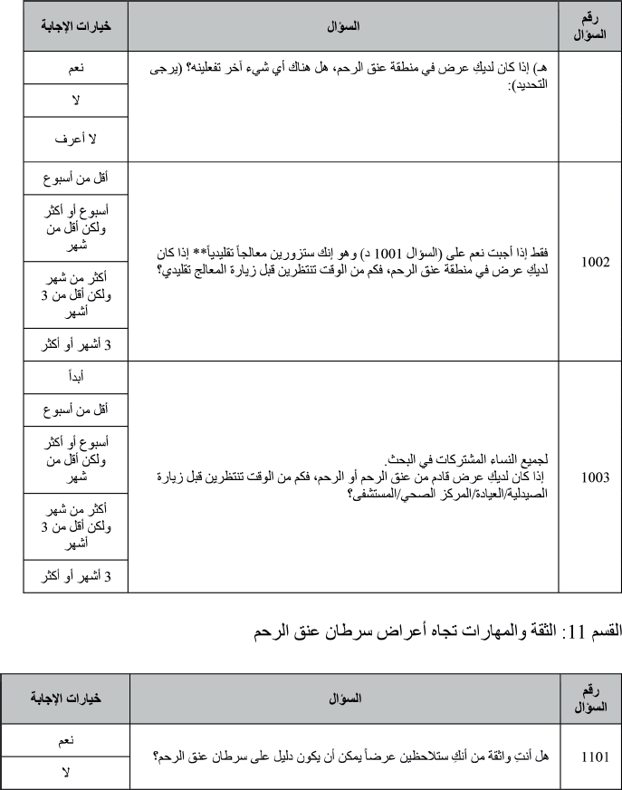 Based on the findings from the expert committee review, internal and external pilot testing, several modifications were implemented to enhance the AWACAN tool's cultural appropriateness, clarity and relevance for the Arabic population. Specifically, questions related to socio-demographic factors, BC and CC risk factors and lay beliefs were revised to address cultural sensitivities and improve comprehensibility. These refinements were informed by feedback from experts, research team members and study participants, ensuring the final questionnaire's suitability for the Arabic context.