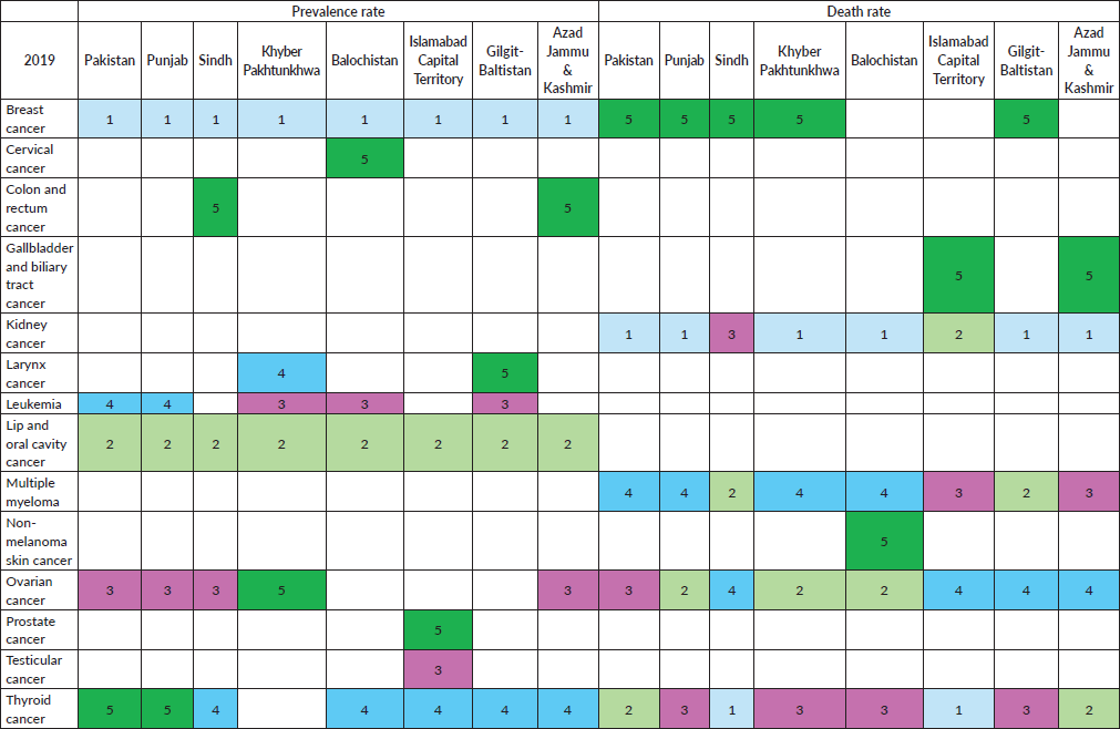 Table 4 shows the most common cancers in various regions of Pakistan based on prevalence and death rate, as of 2019. Breast cancer is the most prevalent cancer type in all regions of Pakistan. Despite its high prevalence, it ranks 5th in terms of death rate in most regions except in Balochistan and Islamabad Capital Territory where it is 6th and 7th, respectively. Lip and oral cavity cancer ranked second across Pakistan. Kidney cancer and multiple myeloma, despite a lower prevalence, show a notably high death rate. Some cancers, like larynx cancer and prostate cancer, show the opposite trend with high prevalence rates but relatively lower death rates.