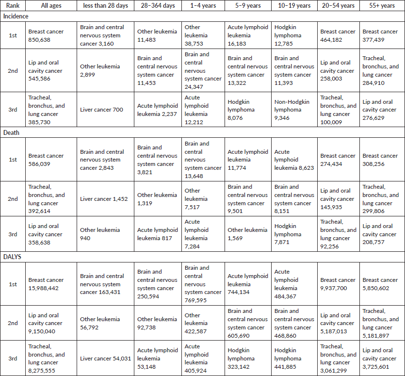 Table 5. Leading cancers by incidence, deaths and DALYs across age groups.