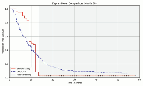 Figure 3. Median PFS in the Al-Beiruni cohort showed a 23.2% gain (1.9 months) compared to the GOG-240 curve. RMST analysis is required to confirm the reliability of this observed advantage.