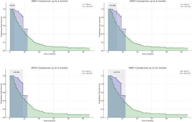 Kaplan–Meier analysis was used to estimate PFS, and 95% confidence intervals were calculated. Restricted mean survival time (RMST) was computed at multiple predefined time points (3, 6, 9 and 12 months) to complement and validate median-based findings. All statistical analyses were conducted using MedCalc Statistical Software (version 23.2.1) and custom Python scripts (Python 3.10) for RMST area-under-the-curve (AUC) computations and curve digitisation. The assumption of proportional hazards was not formally tested in this study. As such, the RMST method was chosen specifically to provide a robust and assumption-free alternative for time-to-event comparisons.