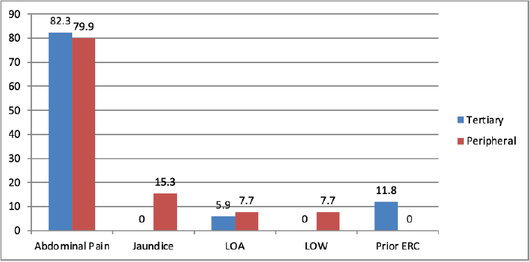 There were no statistically significant differences between the two groups with respect to gender distribution, age, history of abdominal pain, jaundice, weight loss or loss of appetite (Figure 1). Abdominal pain was the most common presenting symptom in both groups, reported in approximately 80% of patients.