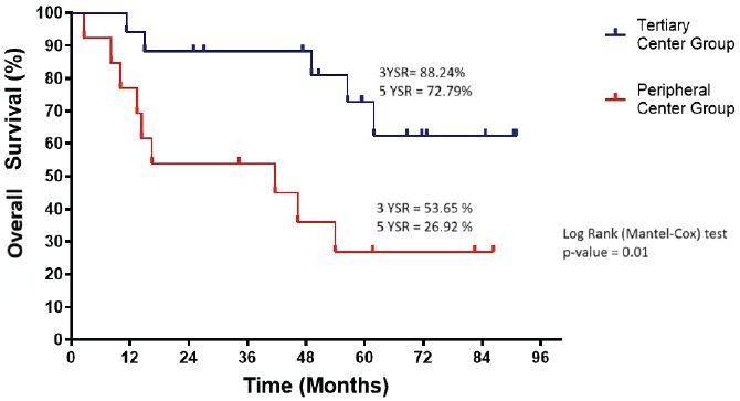 The OS in the tertiary centre group was significantly better than in the peripheral centre group (p = 0.01) (Figure 3). The 3-year and 5-year survival rates were 88.24% and 72.79%, respectively, in the tertiary centre group, compared to 53.65% and 26.92% in the peripheral centre group.