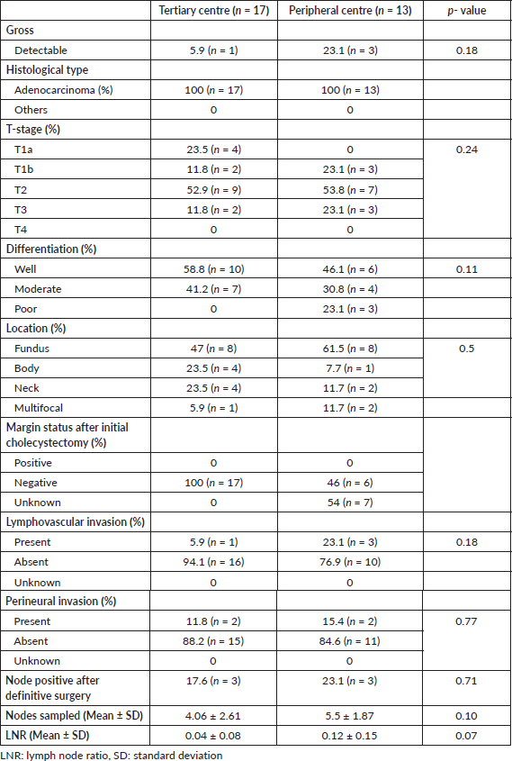 There was no significant difference in histopathological type, T-stage, tumour differentiation and longitudinal anatomical location, resection margin, LVI and PNI in both groups (Table 3). Most common stage of presentation in both groups was T2 (52.9%); however, more patients (23.1%) in peripheral centre group presented with T3 stage as compared to tertiary centre group (11.8%).