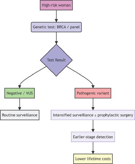 Genetic testing for BRCA1 and BRCA2 mutations represents a cost-effective strategy for managing breast cancer (Figure 1). It enables risk stratification, early surveillance, and preventive interventions, which can reduce late-stage diagnoses, improve survival rates, and lower long-term healthcare costs. In resource-limited settings, where late diagnoses are common and treatment costs are high, BRCA testing could be a sustainable tool for cancer control. Integrating genetic testing into public health strategies could lead to more equitable and efficient cancer care in LMICs, reducing both clinical and financial burdens.