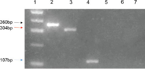 Figure 1. Electrophoretic pattern of the PCR products from the polymorphic regions -1082, -511 and -308 in IL10, IL1-B and TNF-A genes, respectively. 1.5% agarose gel electrophoresis. Lane 1: molecular marker (100 bp DNA ladder); lane 2: the black arrow indicates the 360 bp band that corresponds to the amplification product of -1082 region of IL-10 gene; lane 3: the red arrow indicates the 304 bp band corresponding to the amplification product or the -511 region of the IL1-B gene; lane 4: the blue arrow marks the 107 bp band that represents the amplification product of the -308 region of the gene TNF-A; lanes 5–7: negative controls for each gene.
