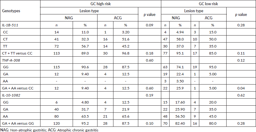Table 3. Genotypic frequencies of cytokine polymorphisms according to the lesion and GC risk population.