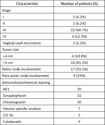 Most patients presented with advanced-stage disease. Four patients were diagnosed at an early stage (Stage I or II), while the majority (68.7%) were Stage III and 12.5% were Stage IV. Two patients had vaginal vault recurrence after surgery performed elsewhere and adjuvant treatment was not taken. Tumour size was more than 4 cm in 26 out of 32 cases (81.2%). Pelvic lymph node involvement was seen in 53.1%, and para-aortic nodes in 29% of cases.