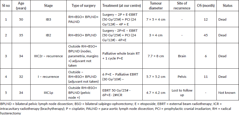 The remaining three patients had surgery performed at outside centres. Two of them (Stage I and Stage IIIC2r) did not receive adjuvant therapy and later presented to our centre with vault recurrence. The fifth patient (Stage IIIC1p) presented to us for adjuvant therapy after surgery and was lost to follow-up after completing treatment. Treatment details and outcome are described in Table 3.