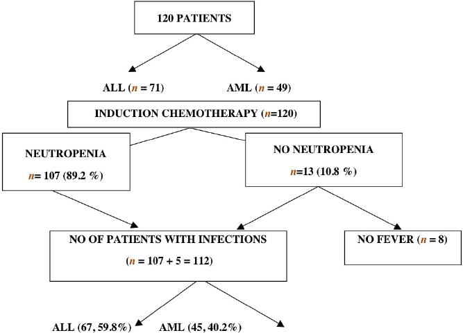 The study population consisted of 120 patients, of which 71 (59.8%) were diagnosed to have acute lymphoblastic leukaemia (ALL), while 49 (40.2%) had acute myelogenous leukaemia (AML). All 120 patients were given induction chemotherapy per protocol. Among the 120 patients, 107 patients had neutropenia, while 13 did not have neutropenia. All 107 patients with neutropenia had evidence of infections. Five patients who did not have neutropenia also had infections (from the 13 non-neutropenic subjects). Thus, 112 patients who had evidence of infection had febrile episodes, while eight patients of the non-neutropenic group did not have a fever. Out of the 112 patients with evidence of infection, 67 of them were patients of ALL, while 45 of them were AML patients.