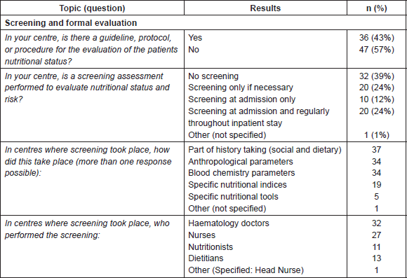 Less than half of respondents (n = 36, 43%) reported having formal guidelines/protocols evaluating patient’s nutritional status, 39% of centres did not perform nutritional screening, and 24% only when necessary. Of those centres performing screening (n = 30, 36%), 12% screened at admission, and 24% at admission and regularly until discharge.